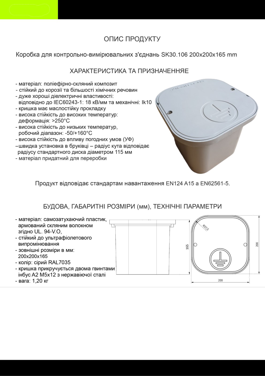 Продукт відповідає стандартам навантаження EN124 A15 a EN 62561-5